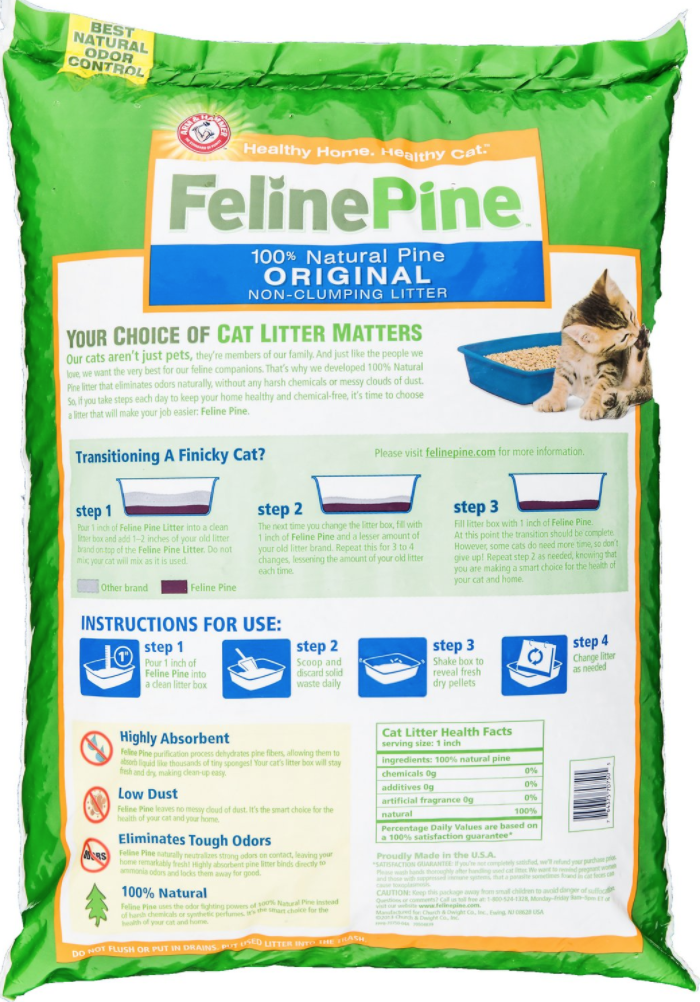 Fill litter box with at least 3 inches of Feline Pine Original Cat Litter. Scoop the solid waste daily and gently shake the box so the good pellets float to the top and the sawdust. Some cats may be allergic to certain types of wood.